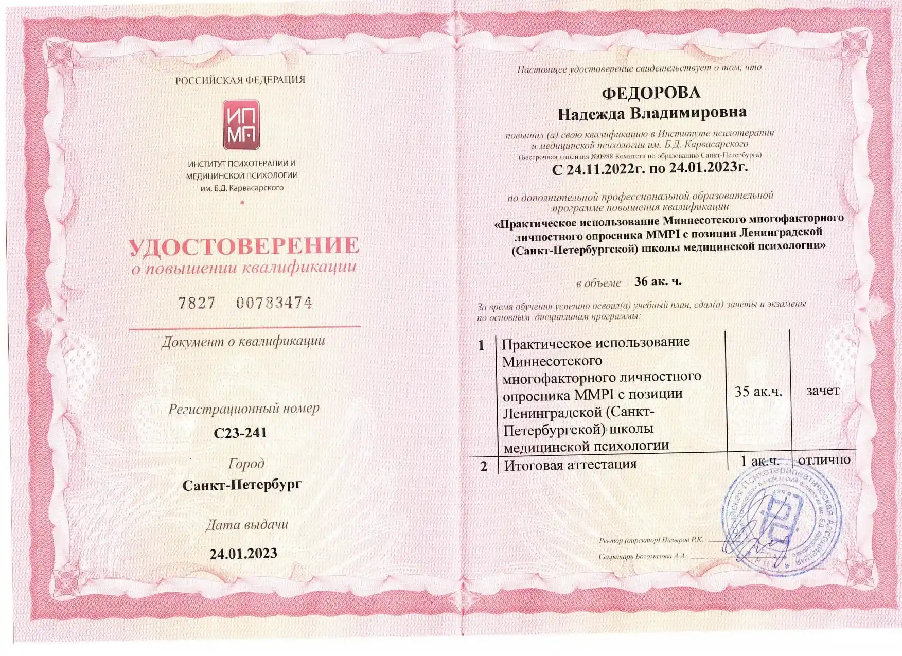 - Институт психотерапии и медицинской психологии РПА им. Б.Д. Карвасарского г. Санкт-Петербург.