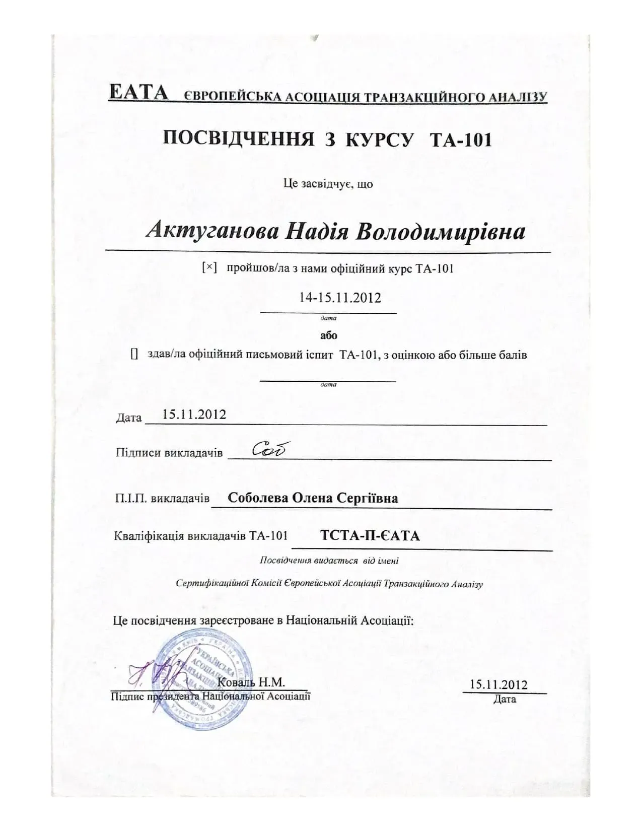 - В 2014 году получила диплом по Личностно-ориентированному уровню когнитивно-поведенческой психотерапии. Работа с когнитивными стилями и стратегиями.