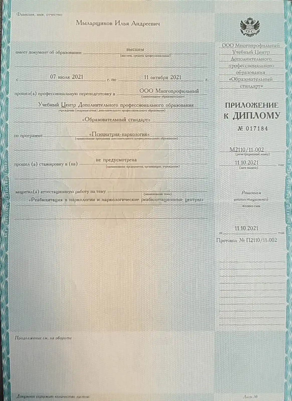 Первый Московский государственный медицинский университет им И.М.Сеченова по специализации психиатр-нарколог